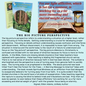 Bible ProphesyFrom the AuthorSound DoctrineSpiritual BlindnessTurning Away ELDON ADAMS | August 29, 2023 THE BIG PICTURE PERSPECTIVE ← THE LAMB’S BOOK OF LIFE ARE YOU PREPARED FOR THE FALSE TEACHERS? (2 Timothy 4:3-4) →