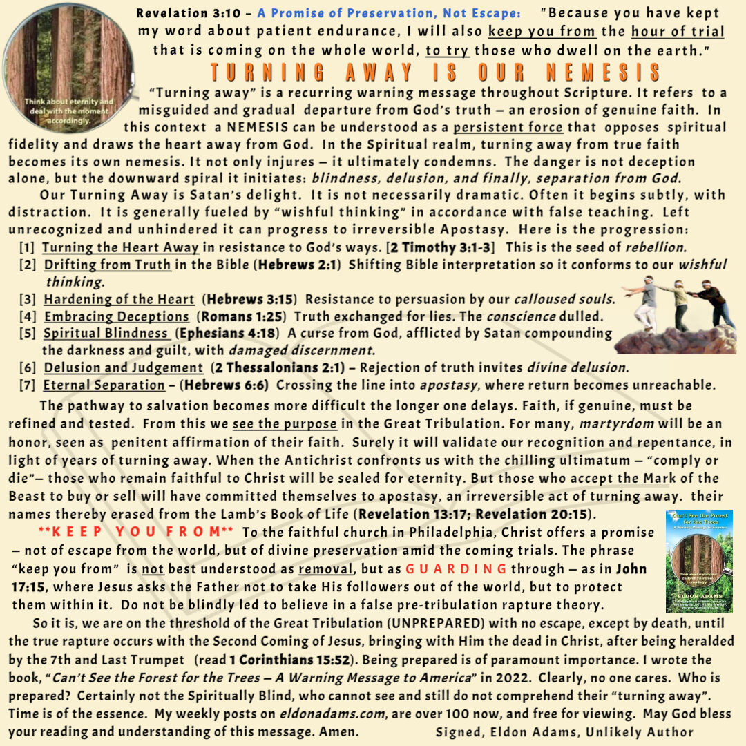 Bible ProphesyFrom the AuthorSound DoctrineSpiritual BlindnessTurning Away ELDON ADAMS | June 25, 2025 TURNING AWAY IS OUR NEMESIS ← THE APOCALYPSE (A BLACK HOLE) MEMORIZING →