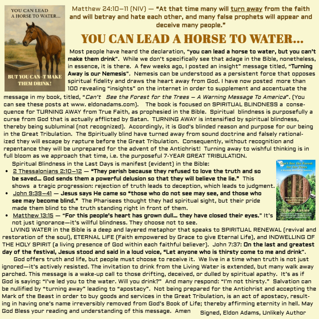 Bible ProphesyFrom the AuthorSound DoctrineSpiritual BlindnessTurning Away ELDON ADAMS | July 13, 2025 YOU CAN LEAD A HORSE TO WATER ← MEMORIZING END TIMES WARNING – FALSE TEACHING →
