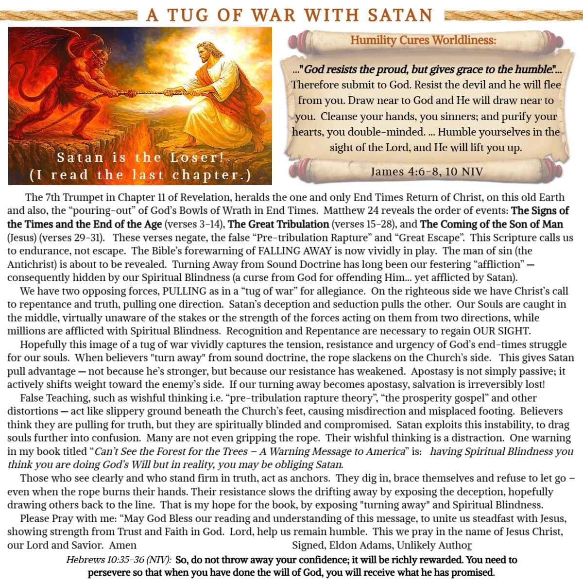 Bible ProphesyFrom the AuthorSound DoctrineSpiritual BlindnessTurning Away ELDON ADAMS | October 2, 2025 A TUG OF WAR WITH SATAN ← THE SIGN OF THE PROPHET JONAH A WARNING MESSAGE TO AMERICA – THE TRUTH →