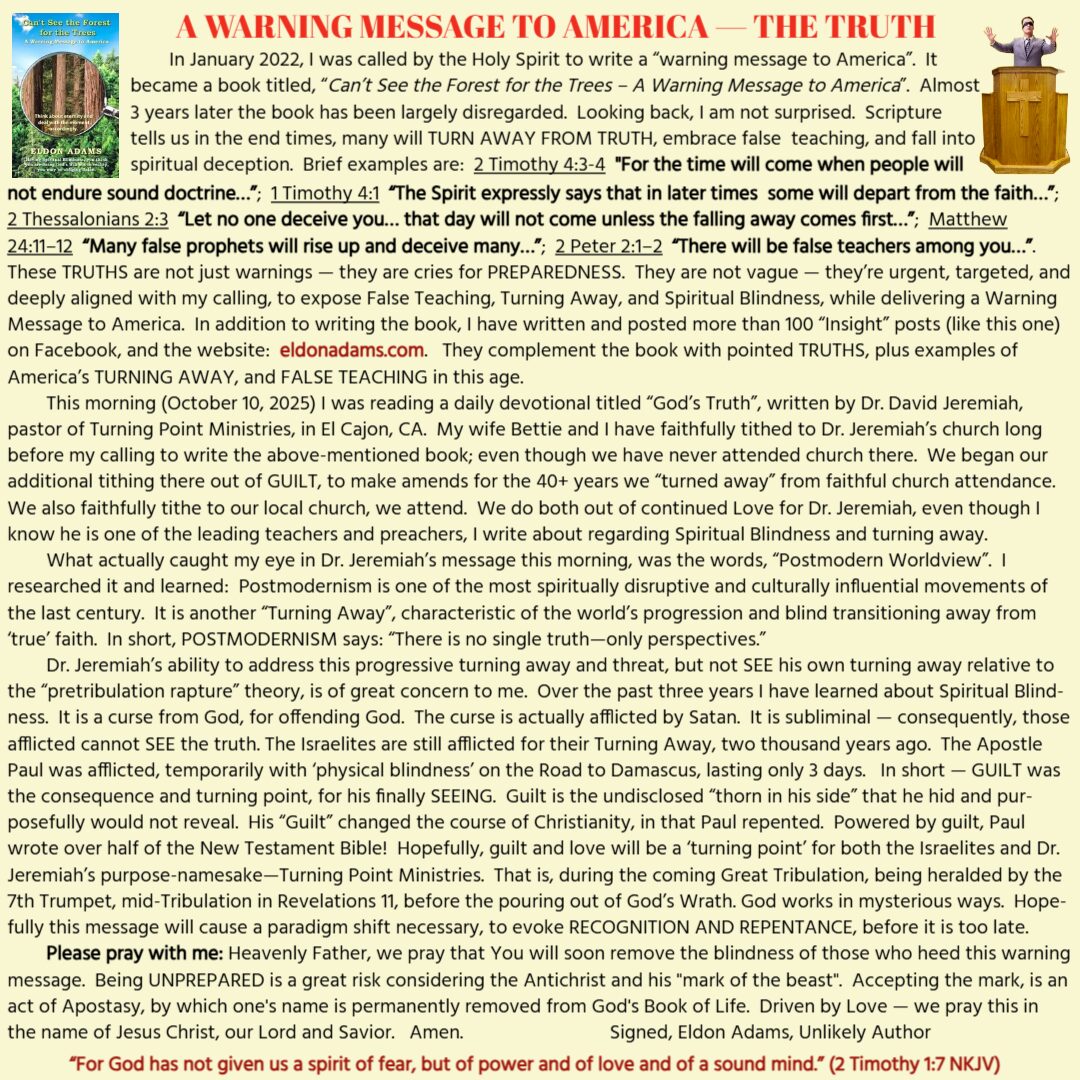 Bible ProphesyFrom the AuthorSound DoctrineSpiritual BlindnessTurning Away ELDON ADAMS | October 13, 2025 A WARNING MESSAGE TO AMERICA – THE TRUTH ← A TUG OF WAR WITH SATAN APOSTASY →